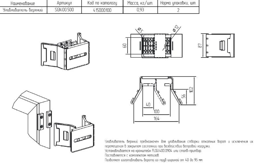 Улавливатель верхний Alutech SGN.00.500 представляет собой специализированный элемент для откатных ворот, предназначенный для их улавливания и фиксации в закрытом состоянии, исключая возможность перемещения из-за ветровых нагрузок или иных внешних воздействий. Он устанавливается на верхней части ворот и обеспечивает их надежное удержание в закрытом положении. К достоинствам данного улавливателя относится его способность обеспечивать дополнительную стабильность и безопасность воротным конструкциям, а также простота монтажа.
